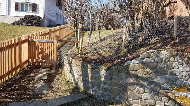 Lärche natur kann im Garten grosse Freude bereiten, z.B. als Staketenzaun „Davos“ mit 30° abgeschrägten Köpfen.